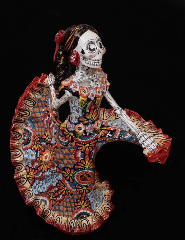 La esqueleto femenina, lujosamente vestida, sigue siendo tanto una aguda sátira cultural como una imagen simbólica de gran respeto en relación con el Día de Muertos en México. Riéndose frente a la muerte, representa la unión del ciclo vital que conecta la vida y la muerte. Puede que no sea una figura ancestral, pero sabe girar una enorme falda típica de Jalisco, sabe bailar, y México baila con ella.