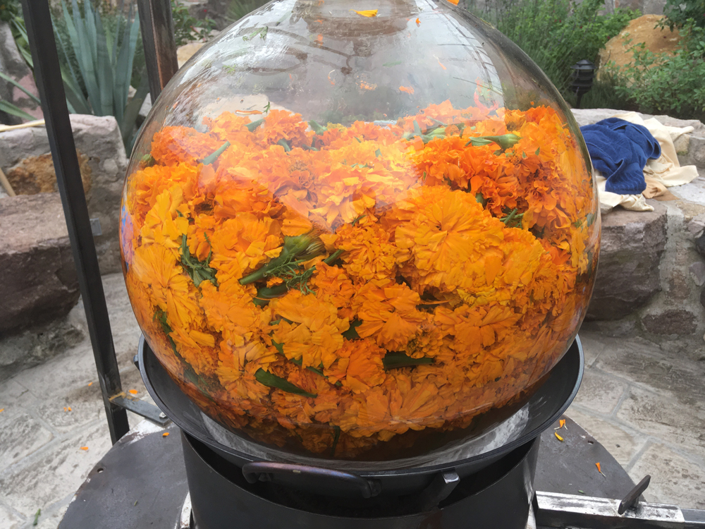 Mientras escribo esto, Día de Muertos, el Día de los Muertos, está a la vuelta de la esquina. En México es un tiempo de reflexión cultural sobre la idea de la muerte, que en realidad es una meditación sobre la sustancia de la vida. Y esto se relaciona directamente con mi indagación sobre la naturaleza de la Vida, tal como se manifiesta a través del perfume. Planeo destilar, para obtener aceite esencial, las brillantes flores de la caléndula conocida localmente como cempasúchil, a la que deberíamos venerar, pues sirve como el núcleo de esta rica festividad. En mi opinión, es el perfume de las flores, más que su color brillante, el que servirá de docente, guiando las almas de los muertos de regreso al ámbito de los vivos.