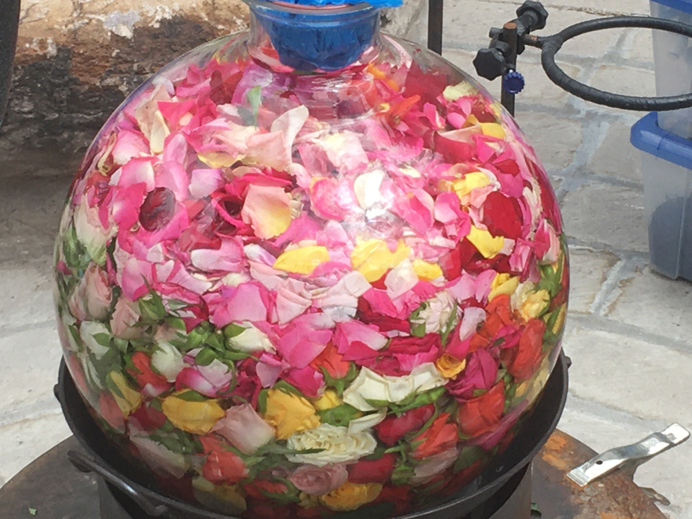 En realidad, el conjunto completo de consideraciones es un poco más complicado, pero ¿la idea queda lo suficientemente clara? Nuestro aparato es capaz de producir aceites bastante elegantes, incluso resaltantes. Además, sirve como una gran herramienta didáctica, por estar hecho puramente de vidrio, de modo que podemos observar visualmente en tiempo real cada fase de la transformación mediante la cual el material vegetal aromático se convierte en aceite esencial y en hidrolato.