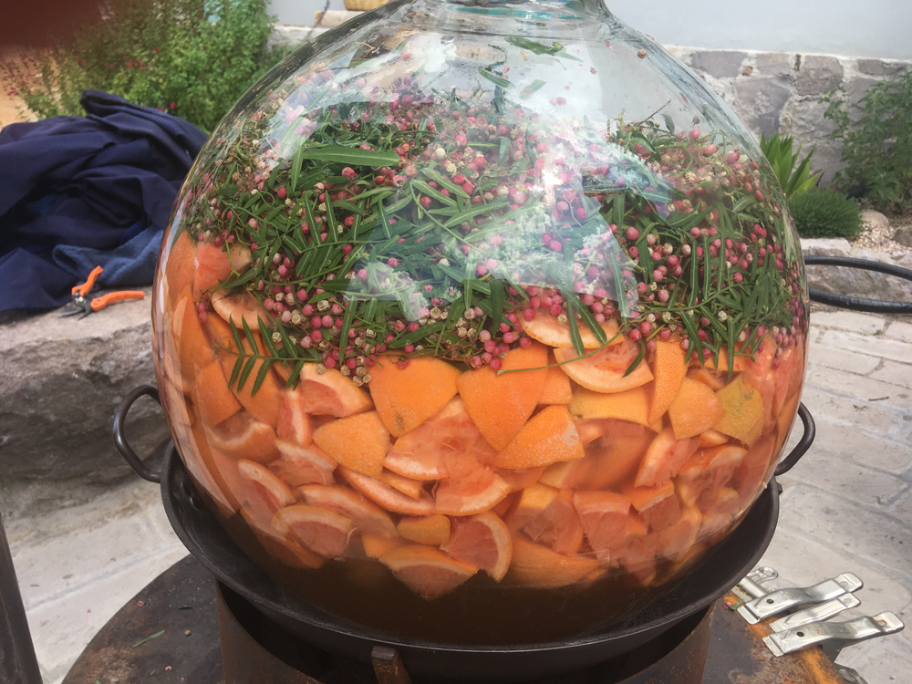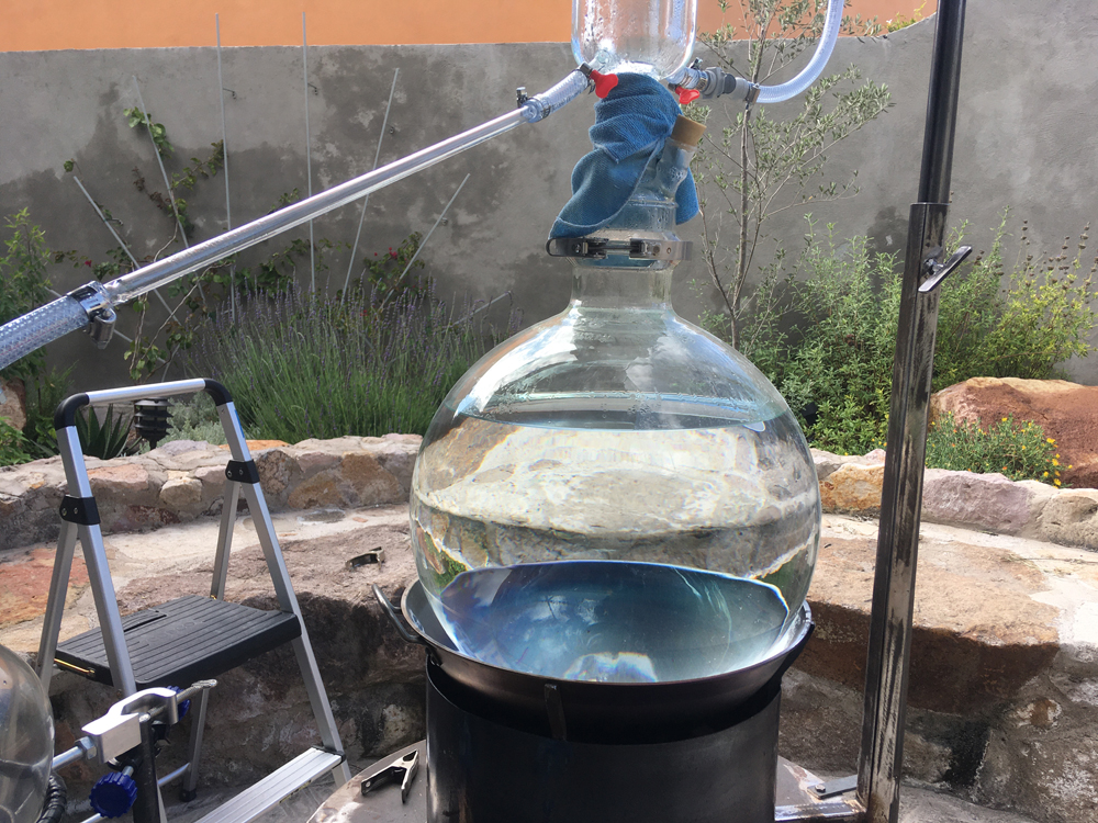 Sin embargo, sin un diseño especializado, estos mismos componentes lábiles están amenazados de degradación química, conversión o pérdida durante el proceso de destilación. Idealmente, particularmente a mayores elevaciones, el sistema debe ser cerrado y hermético, y la condensación debe ser rápida y eficiente. Lo cual me lleva a presentar el llamativo aparato que tenemos la fortuna de operar aquí en San Miguel de Allende. (Y pido disculpas de antemano, ya que esta descripción podría tornarse un tanto técnica.)