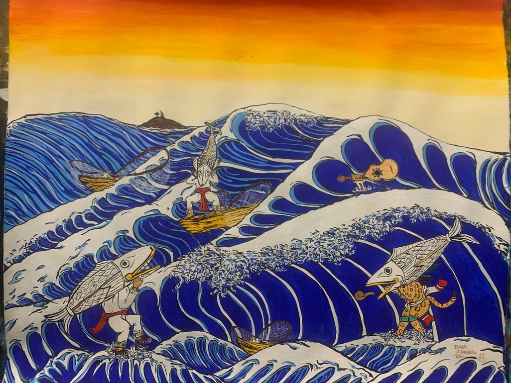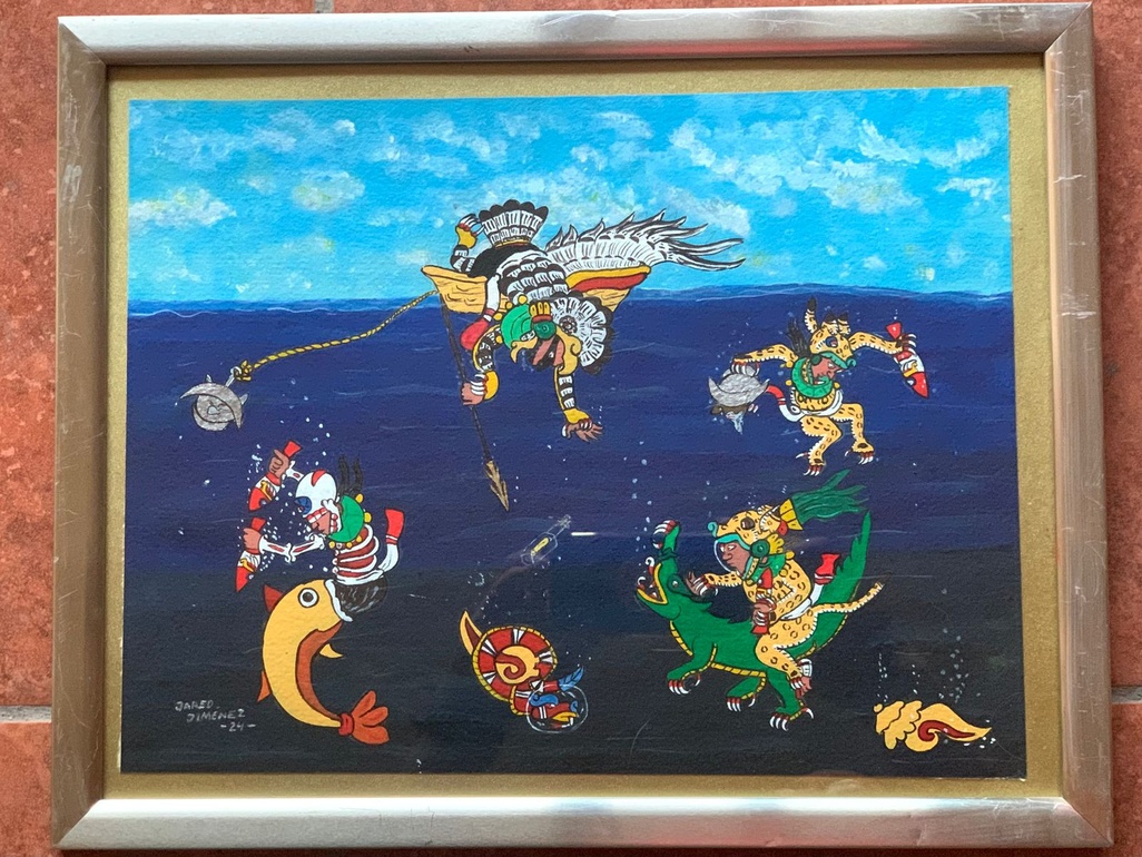 Originally from Morelia, Michoacán, Jared Jiménez is a visual artist and a musician who explores pre-Hispanic themes in both artistic practices. His recent series of paintings grows out of his interpretation of the imagery of the codices, the only books by indigenous Mexicans to survive the conquest. Another series is based on his enthusiasm for a contemporary indigenous dance phenomenon known as Los Kurpites. Jiménez studied fine arts and music at Bellas Artes in Morelia and moved to San Miguel de Allende five years ago. He has played with Jadhex Sonidos Prehispánicos since 2008, touring with them throughout Mexico. Closer to home, he plays cumbia with Grupo Malo at many San Miguel night spots.