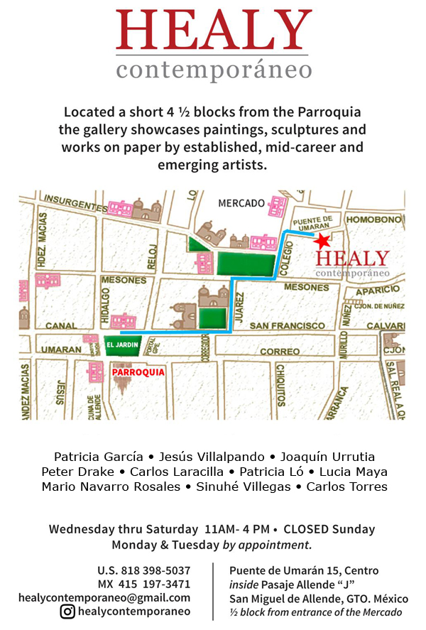 A combustible combination of artists, from the formidable vanguard of the new, emerging Guadalajara art scene arrive here in San Miguel. Together, artists Patricia García, Carlos Laracilla, Joaquín Urrutia and Jesús Villalpando (Feng Chuy) create a diverse, inspiring exhibit without limits. HEALY contemporáneo Puente de Umaran 15 free ![]() ![]() ![]() ![]() ![]() |