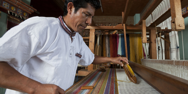 Para producir sus tapetes y finos colgantes murales, Jacobo y su familia primero preparan la lana hilada a mano desde su estado rústico hasta convertirla en hilos. |