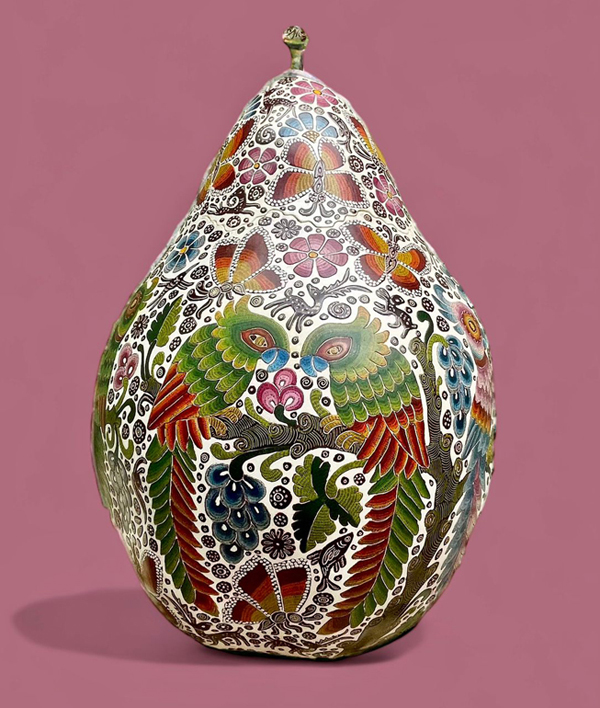 The Olinalá scratching technique is elaborated with the mineral dolomite, combined with chia oil and pigmented with natural dyes produced in the region.