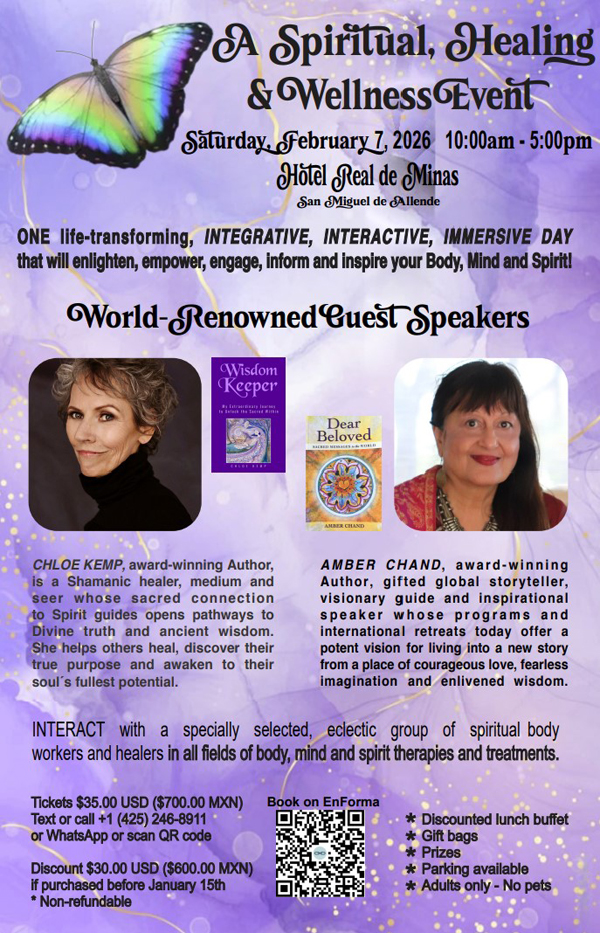 ![]() Experience one integrative, interactive, immersive, life transforming day of discovery, enlightenment, education, empowerment and inspiration, for the body, mind and spirit. Meet the body workers and healers here to help you navigate these challenging times. You can cleanse Karma, re-birth, re-new, find hidden or neglected talents or gifts you possess; the transformation is unlimited! Hear powerful, profound stories from two world-renowned keynote speakers: Chloe Kemp, award-winning author of The Wisdom Keeper is a Shamanic Healer, Medium, and Seer whose sacred connection to Spirit Guides opens pathways to Divine truth and ancient wisdom. She helps others heal, discover their true purpose and awaken to their soul's fullest potential. Chloe offers intuitive shamanic energy healings in-person in San Miguel and remote sessions worldwide. "This Spiritual, Healing, and Wellness Event is a sanctuary for renewal, connection, and transformation. It will be an interactive, immersive day, offering a safe and sacred space to reconnect with your own light and learn how to tap into a healthier, happier life. I'm honored to be one of the main speakers for the event." Amber Chand, award-winning author of Dear Beloved: Sacred Messages to the World is a gifted global storyteller, visionary guide, inspirational speaker whose Dream A New Dream programs and international retreats today offer a potent vision for living into a new story from a place of courageous love, fearless imagination and enlivened wisdom. She will offer a variety of story telling sessions, retreats and visionary coaching the month of February in San Miguel. "We live in a time of seismic shifts and uncertainties, which is why it is even more vital that we come together in collective spaces which seek to nourish our souls, energize our bodies and enliven our beings. The inaugural Health and Wellness Summit in San Miguel, has been designed as a transformative experience to do just that. I am honored to be one of the keynote speakers at the event. Join us." Amber Chand, Visionary Guide and Global Storyteller. Book here |