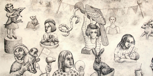 Las superficies texturizadas y el uso del material de dibujo más primitivo —el carbón— remiten a la primera celebración del entorno por parte del ser humano: las pinturas rupestres prehistóricas. |
