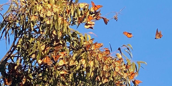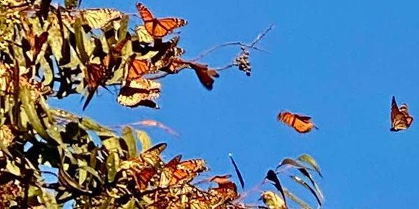 La semana pasada un caminante al atardecer se detuvo sobrecogido ante uno de los espectáculos más conmovedores de la naturaleza — un remolino de miles de mariposas Monarca descansando sobre un altísimo árbol de eucalipto. |