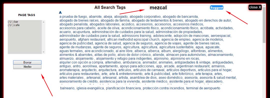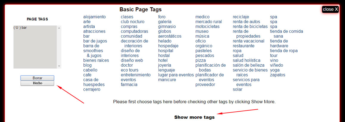 Elegir palabras claves para la búsqueda Elegir palabras claves (tags) para tu página. Haga clic en Hecho cuando haya terminado o haga clic en "Show more tags" para ver más opciones. (Usted puede regresar y añadir más etiquetas más tarde - ver abajo.)